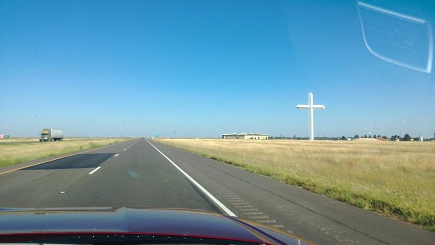 Ah, Texas. How I loathe thee. And it was particularly painful that pulling a trailer, we could only cross it at max 70 miles an hour. And the times where we could go max were few and far between as they have road problems that rival Arizona. We learned to watch the truckers very closely. They knew where the potholes that would swallow a small car were hiding in the flat, flat, flat landscape. Of course, that flat landscape helped make sure you didn’t miss this little cross.